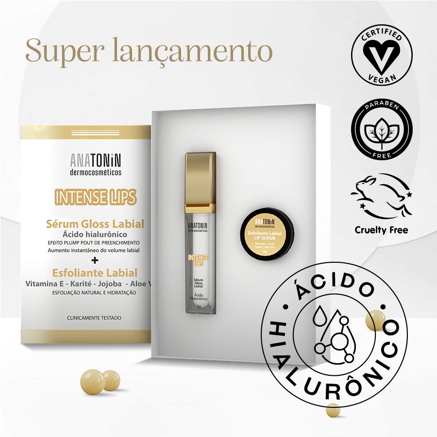 Um Sérum Gloss Labial com ácido hialurônico que promove efeito PlumpPout de preenchimento, ou seja, intensifica a durabilidade do ácidohialurônico injetável e diminui as rugas finas dos lábios, que opreenchimento por si só não melhora.